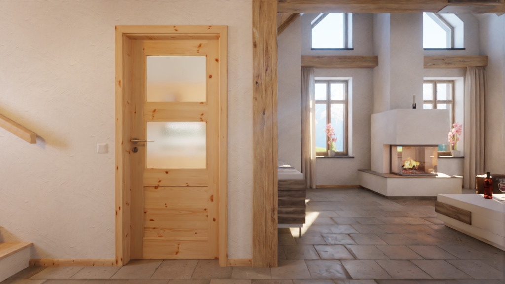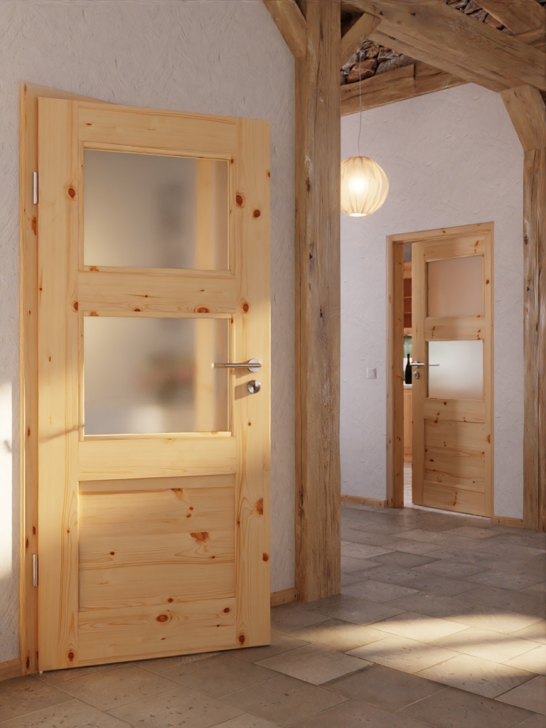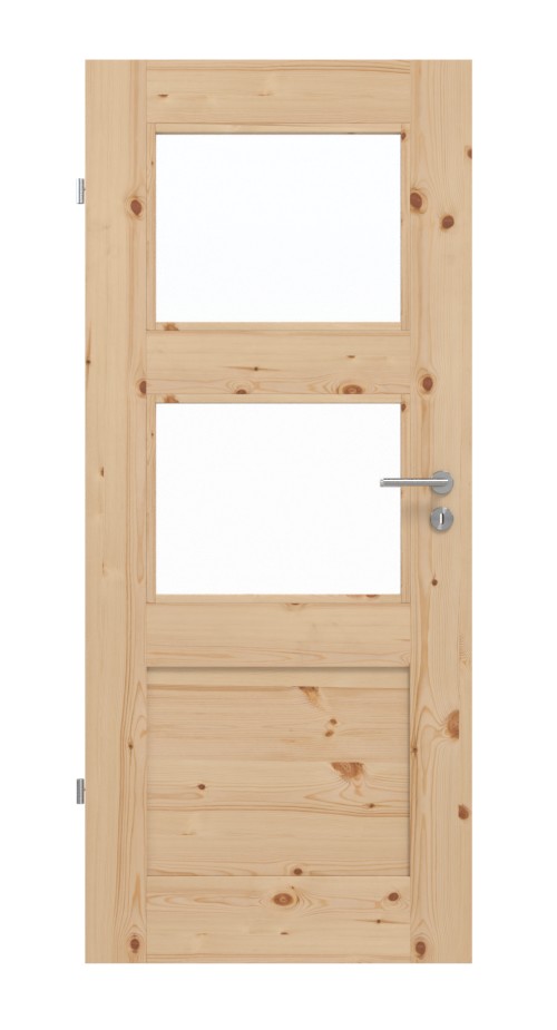 Nowoczesny design z dwoma przeszkleniami i wypełnieniem z prawdziwego drewna zachwyca swoją prostą linią. W drewno sosnowym wyraźnie rysują się charakterystyczne ramy sęków, nadając mu rustykalny charakter.