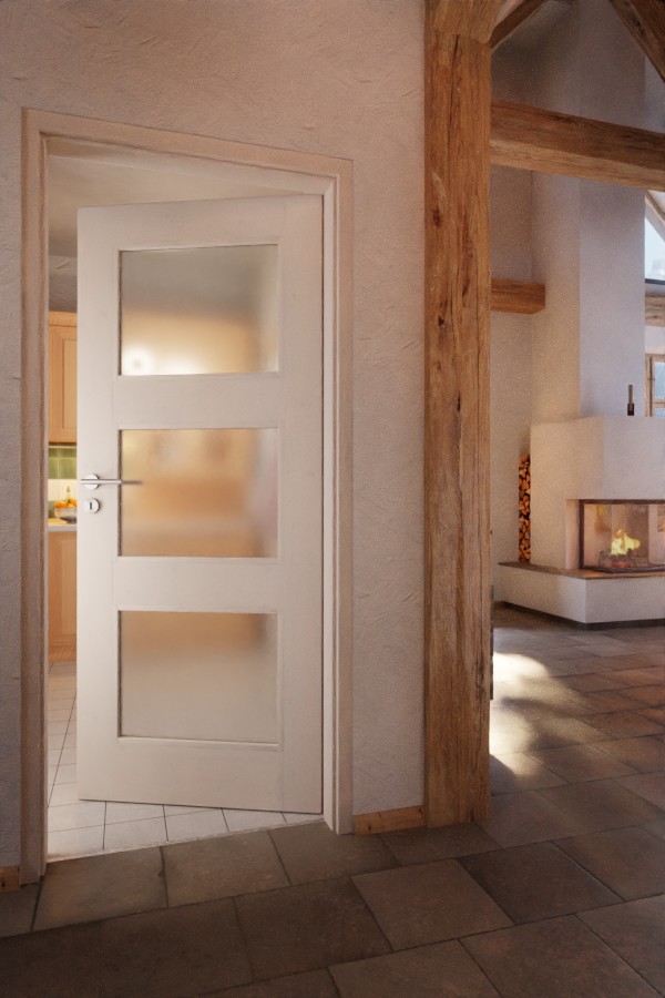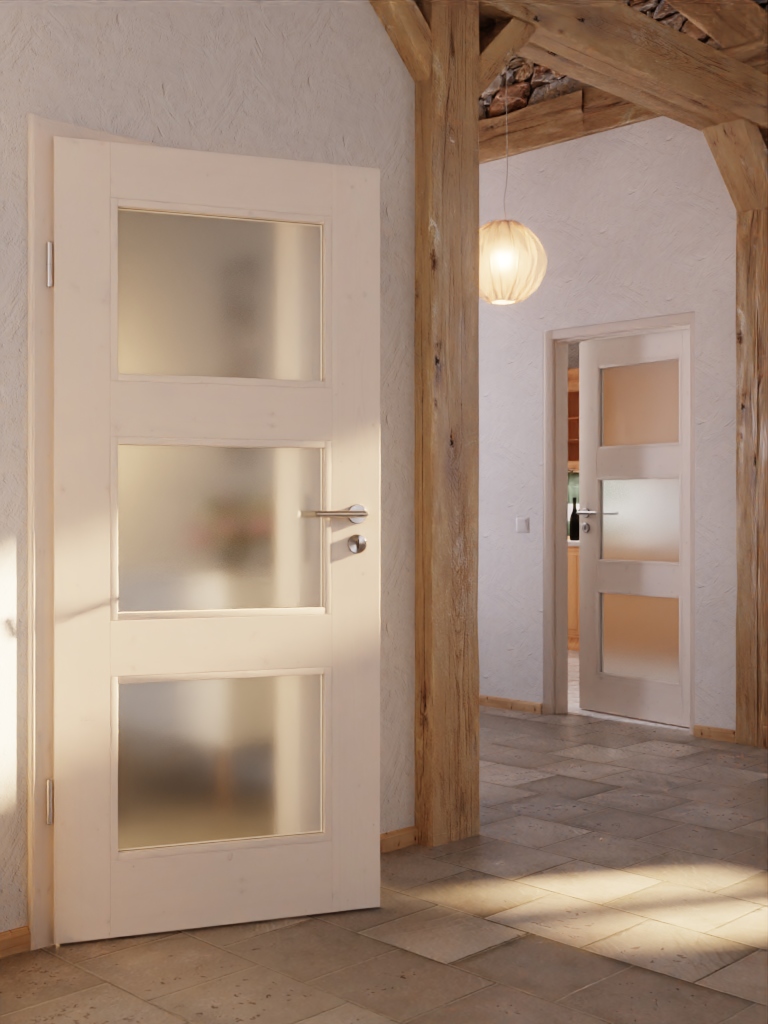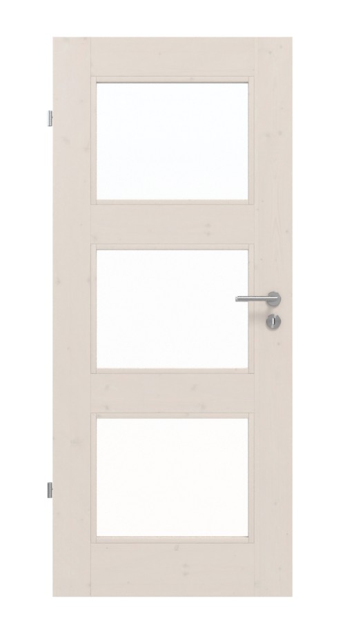 Dzięki trzem przeszkleniom do Państwa wnętrz wpada mnóstwo światła. Biała pigmentacja nadaje drewnu świerkowemu przyjazny wygląd. Pod tym widoczne są delikatnie zarysowane słoje drewna z wlotami gałęzi, które czynią każdą płytę drzwiową unikalnym dziełem.