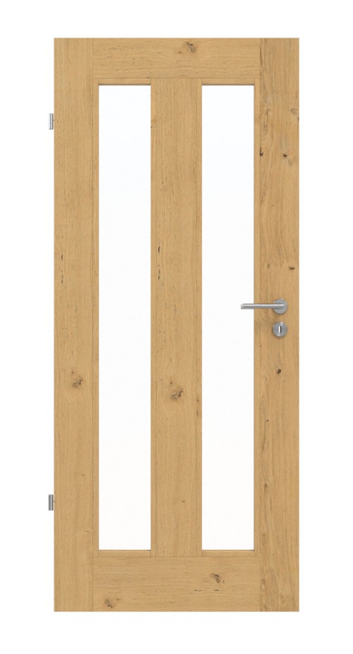 W swojej minimalistycznej formie dwa smukłe przeszklenia i proste listwy łączą się w nowoczesny design z klasą. Sękowana struktura dębu jest unikalna na każdym skrzydle drzwi.