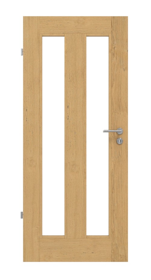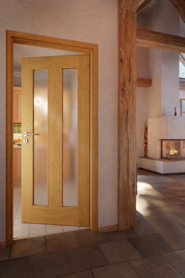 Dwa wąskie przeszklenia charakteryzują bezpretensjonalny nowoczesny design. Charakterystyczne słoje przebiegają przez ciepłe drewno dębowe i nadają każdemu skrzydłu drzwi indywidualny charakter.