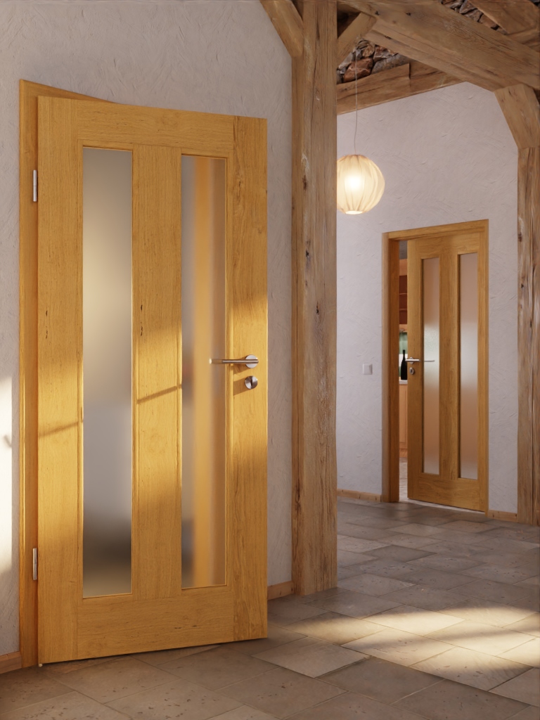 Drzwi z litego drewna klejone warstwowo wyróżniają się szczególnie wysoką stabilnością. Drewno pozostaje w standardzie nieobrobione, co daje największą swobodę twórczą przy wyborze ulubionego koloru. W menu konfiguracji dostępne są również różne wykończenia powierzchni, jeśli chcesz otrzymać drzwi z gotowym wykończeniem.