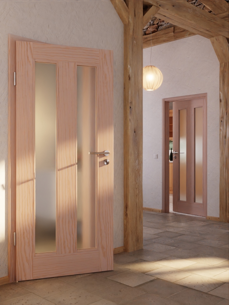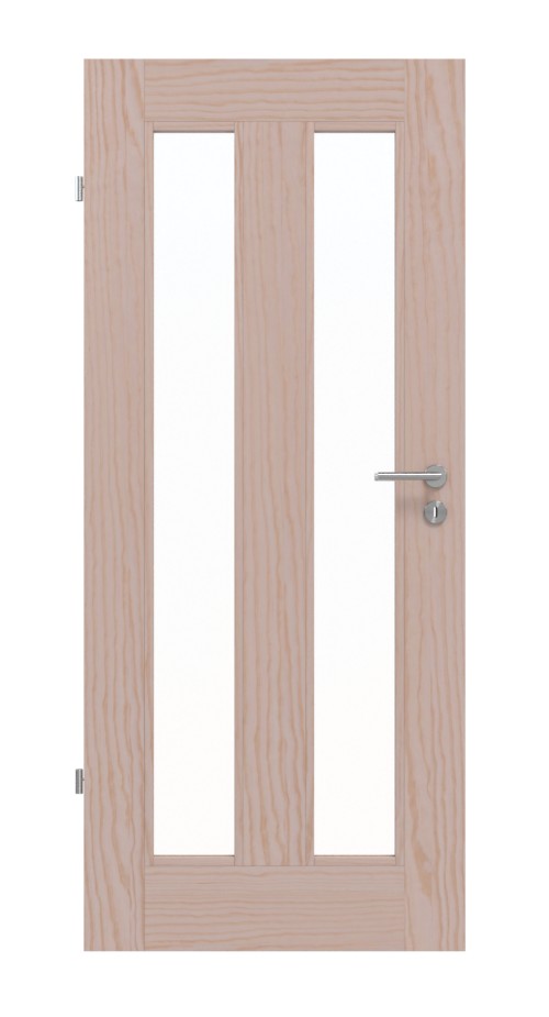 Proste kontury tworzą dwa przeszklenia i szerokie listwy, co daje nowoczesną estetykę. Dzięki zawsze indywidualnie przebiegającej słojowości drewna sosnowego każda drzwi zyskuje unikalny charakter.