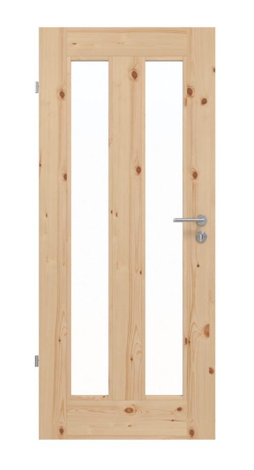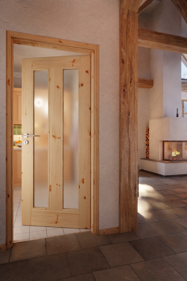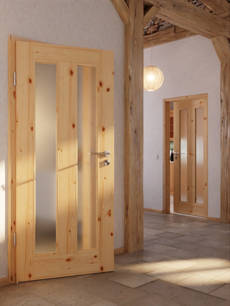 Proste kontury tworzą dwa przeszklenia i szerokie listwy, co daje nowoczesną estetykę. Rustykalny charakter drewna sosnowego jest w dużej mierze kształtowany przez wyraźne sęki.