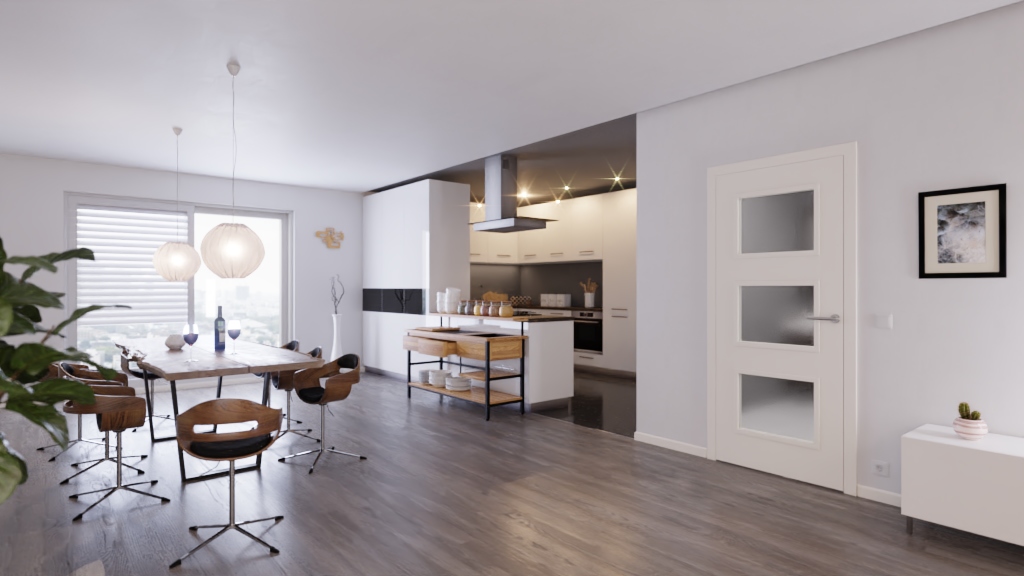 Nowoczesność na nowym poziomie: Drzwi wewnętrzne LA-35 w białym lakierze RAL 9010 wyróżniają się swoją funkcjonalnością, ponieważ można je otwierać przez oścież.