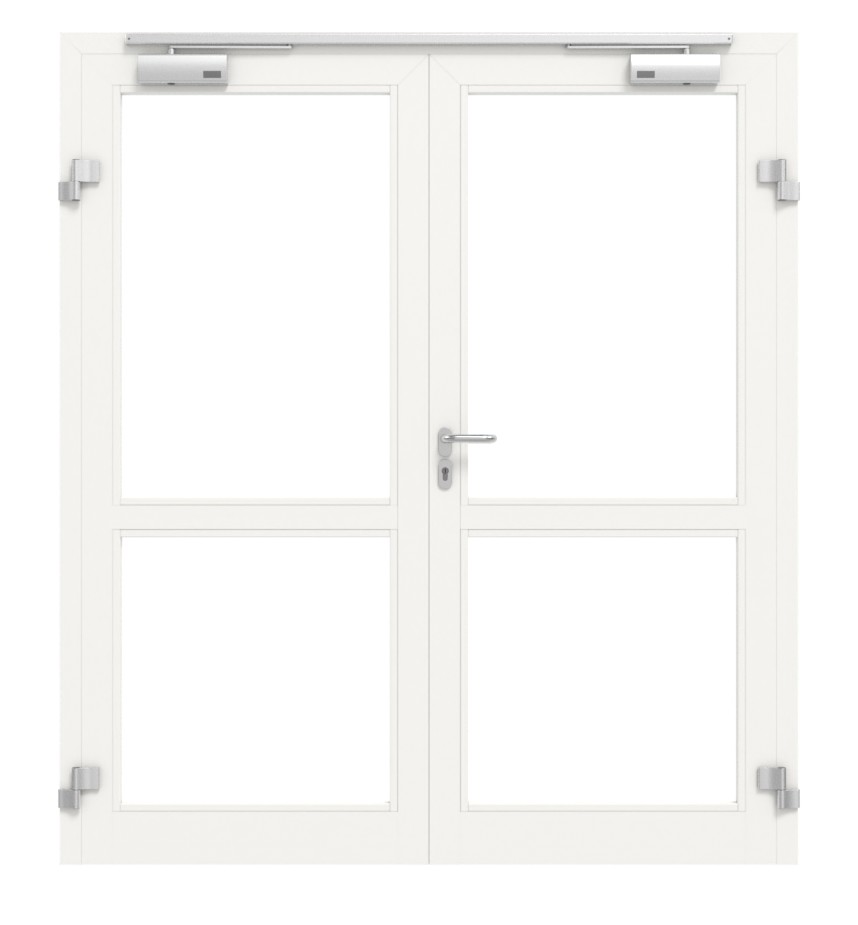 Minimalistyczne wykończenie wizualne drzwi dwuskrzydłowych mówi samo za siebie. Szklana powierzchnia na obu skrzydłach oraz poprzeczny szpros umieszczony na każdym skrzydle tworzą razem spójną całośc.