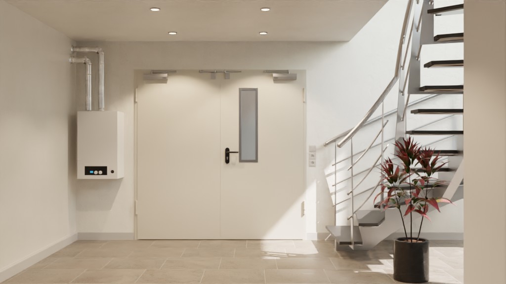 Aktywne skrzydło posiada wąski, prostokątny otwór w postaci przeszklenia z szkleniem przeciwpożarowym. Otacza ją nakładany, zagruntowany profil stalowy. Aby uzyskać harmonijny wygląd, skrzydła drzwi są zlicowane w przejściu.