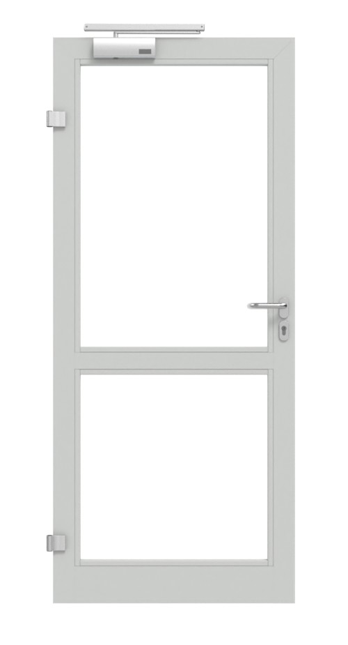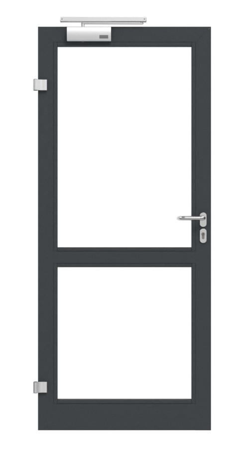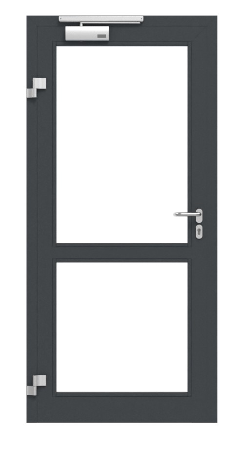 Niezawodne i funkcjonalne: Kompletny zestaw RS 150 LA-02 firmy Hörmann zachwyca drzwiami ramowymi aluminiowymi z funkcją przeciwpożarową, w tym ościeżnicą blokową i zestawem klamek.