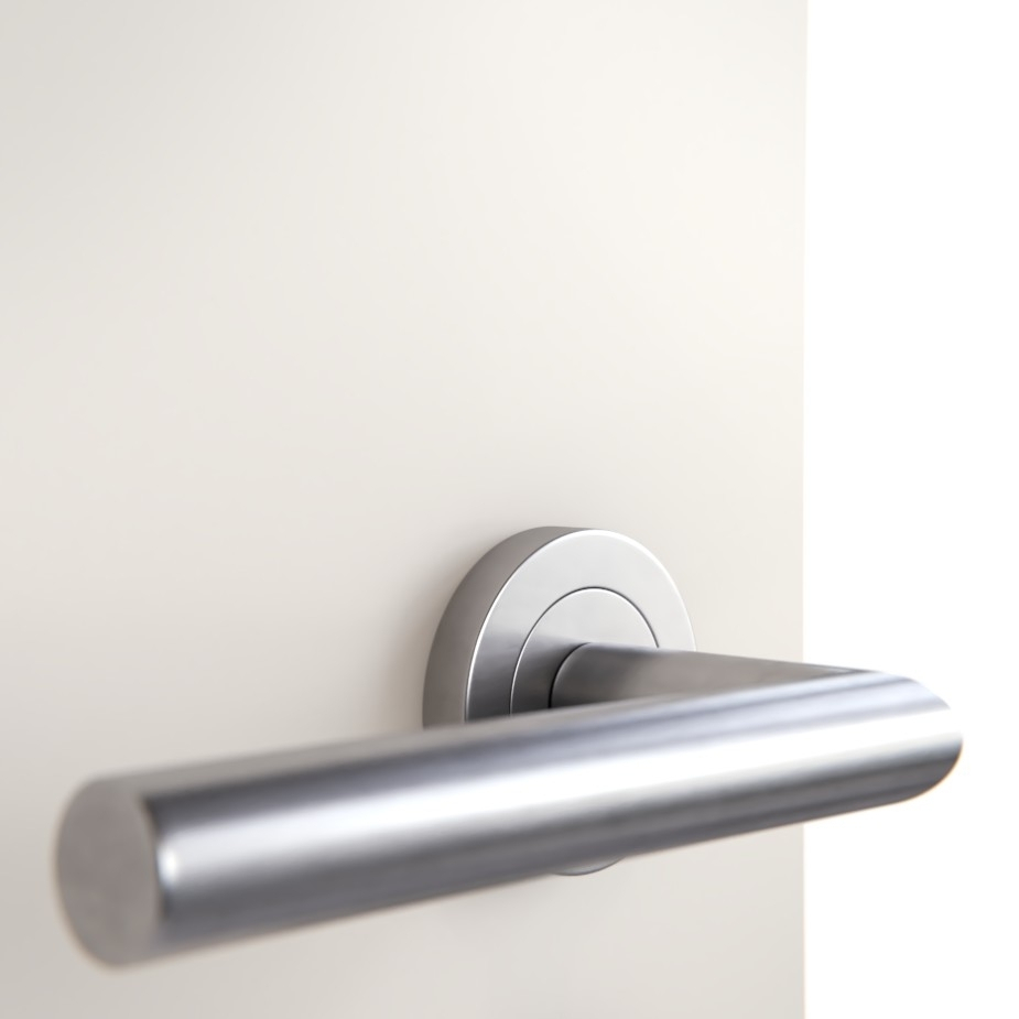 Gładkie, wpuszczane drzwi pokojowe wyróżniają się prostokątnym krawędziowaniem. Ościeżnica jest fabrycznie przygotowana do montażu wpuszczanego skrzydła drzwiowego. Niewidoczne, ukryte zawiasy Tectus umożliwiają płynne przejście między drzwiami a ościeżnicą. Drzwiowa klamka ze stali nierdzewnej w satynowym wykończeniu dopełnia ofertę zestawu.
