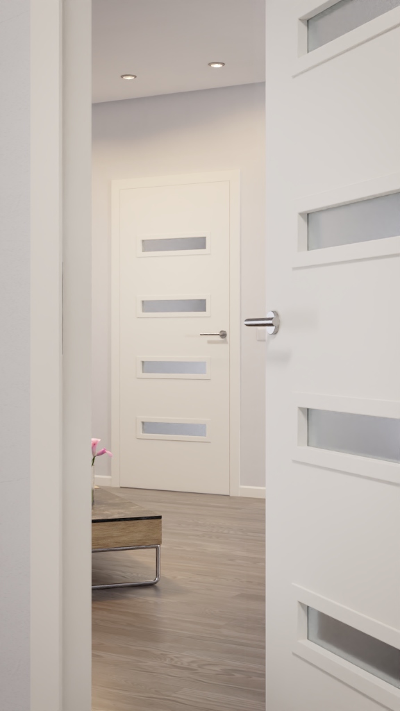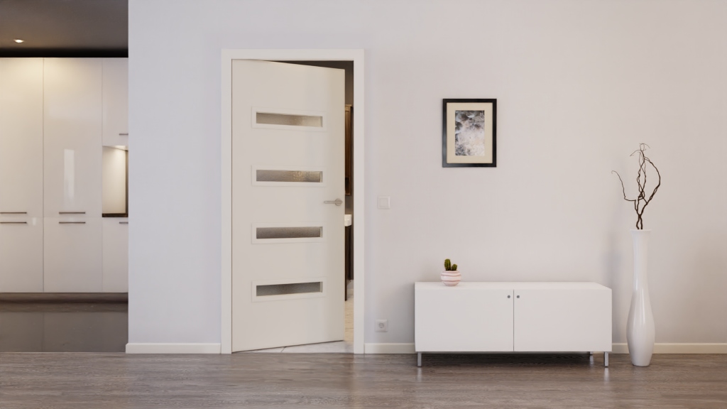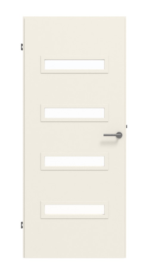 Skrzydło drzwiowe z czterema wąskimi wycięciami na światło prezentuje się nowocześnie i jest zgodne z aktualnymi trendami. Poprzeczne świetliki podkreślają wnętrze, nie przytłaczając go. Opcjonalnie listwy szklane mogą być wykonane w wersji zlicowanej z powierzchnią. Warstwa wierzchnia jest wielokrotnie lakierowana w klasycznym odcieniu bieli RAL 9010 . Dzięki temu zyskują Państwo wysokiej jakości powierzchnię, która cieszy zarówno wzrok, jak i dotyk.