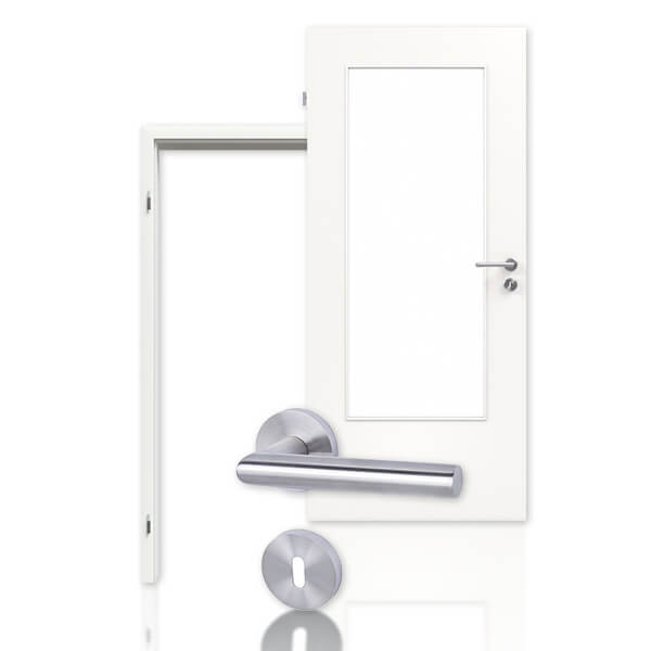 Sprytne oszczędzanie: Skorzystaj z naszego zestawu oszczędnościowego z drzwiami wewnętrznymi LA-DIN w białym lakierze RAL 9016 wraz z ościeżnicą i klamką.