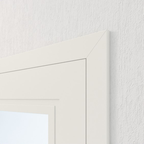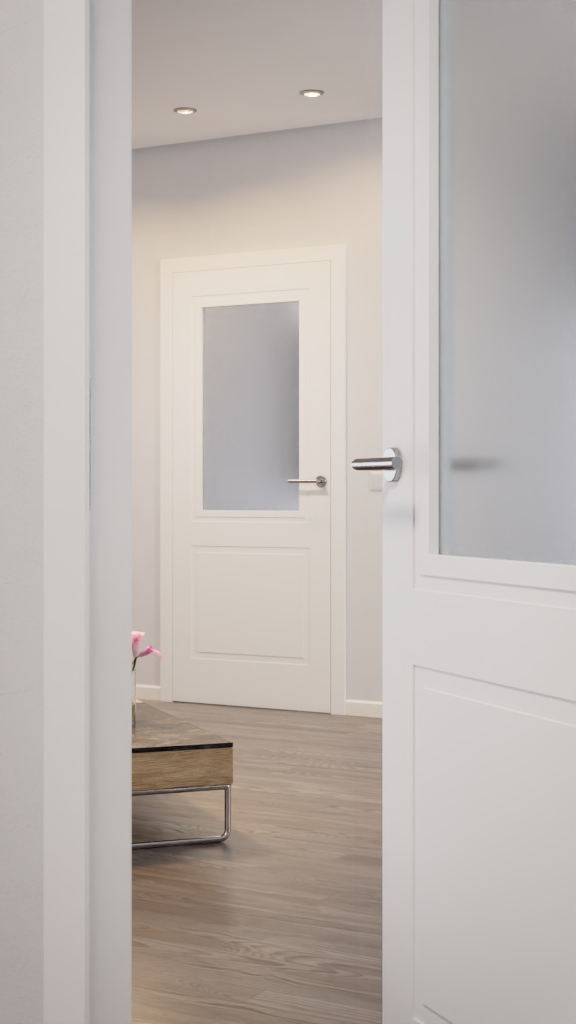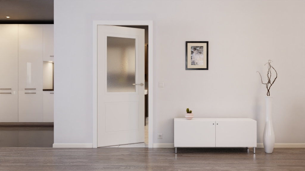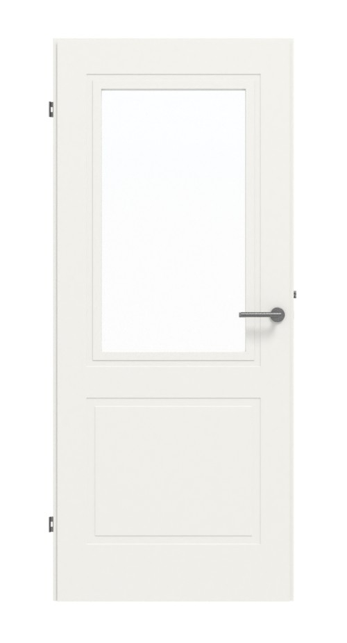 W górnej połowie skrzydła drzwiowego znajduje się przeszklenie z listwami zlicowanymi z powierzchnią. Pod spodem znajduje się nieco mniejsze wypełnienie z dyskretnymi frezowaniami, które dopełniają ogólny efekt wizualny.
