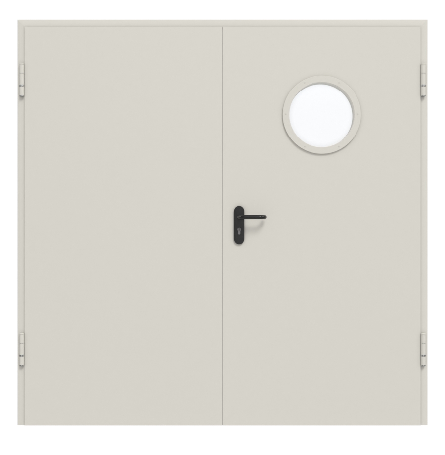 Ten zestaw drzwi wewnętrznych od Hörmann zawiera stalowe drzwi wielofunkcyjne D65-2 OD LA z oknem, ościeżnicę oraz klamkę: