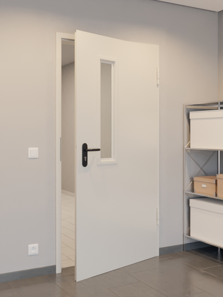 Robustne stalowe drzwi wewnętrzne D65-1 OD z przeszkleniem, z ramą DryFix i klamką: