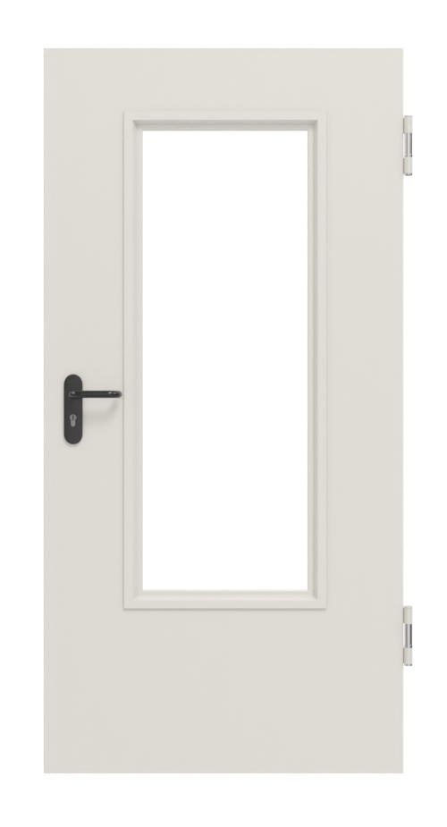 Stalowa drzwi wewnętrzne wielofunkcyjne D65-1 OD od Hörmann z dużym przeszkleniem, ościeżnicą blokową i klamką: