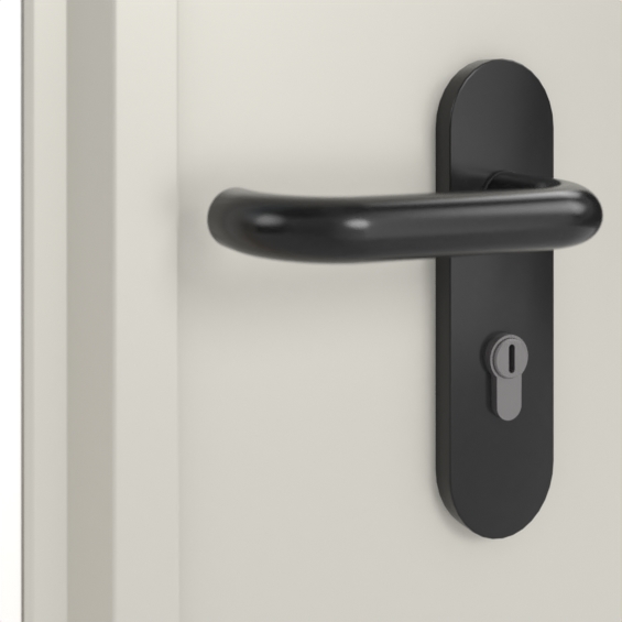 Czarny komplet klamek z tworzywa sztucznego typ D-110 z krótkim szyldem uzupełnia kompletny zestaw: