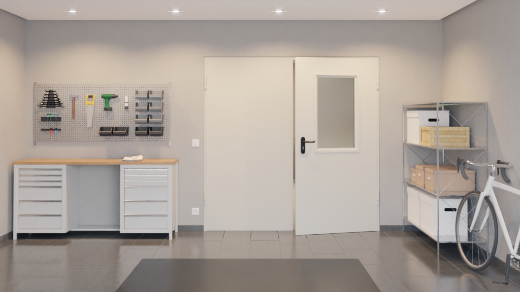 Prawdziwy wszechstronny produkt: Komplet ny zestaw zawierający dwuskrzydłowe stalowe drzwi wielofunkcyjne D65-2 OD LA-B2, ościeżnicę blokową i klamkę renomowanego producenta Hörmann jest bardzo wytrzymały i posiada przeszklenie w górnej części aktywnego skrzydła.