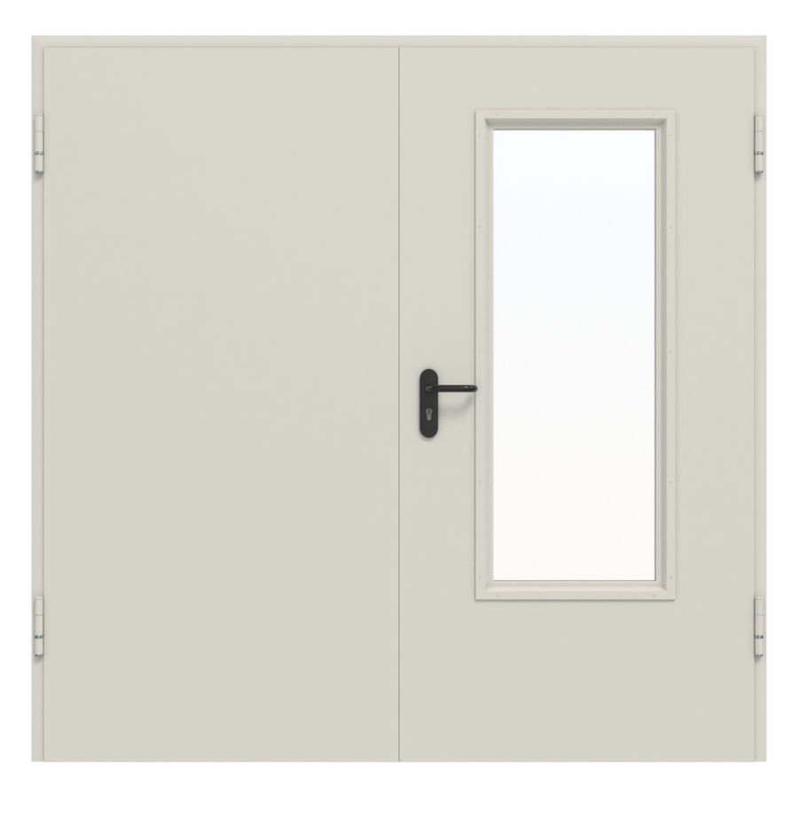 Przydatny zestaw kompletny marki Hörmann obejmuje stalowe drzwi wielofunkcyjne D65-2 OD LA-B3, ościeżnicę oraz klamkę: