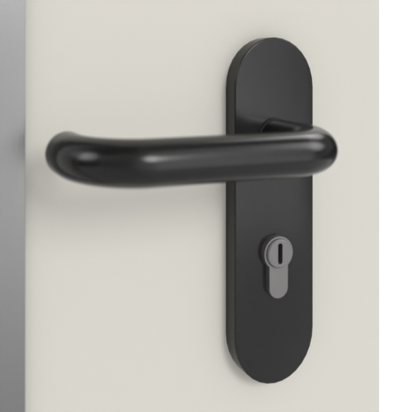 Czarny komplet klamek z tworzywa sztucznego typ D-110 z krótkim szyldem dopełnia kompletny zestaw: