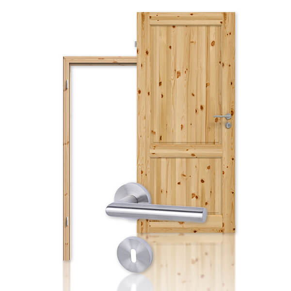 Wygodne zakupy: Ciesz się korzyściami oszczędnościowymi i zabezpiecz drzwi wewnętrzne z litego drewna Typ 02-02 z sosny wraz z odpowiednią ościeżnicą i klamką.