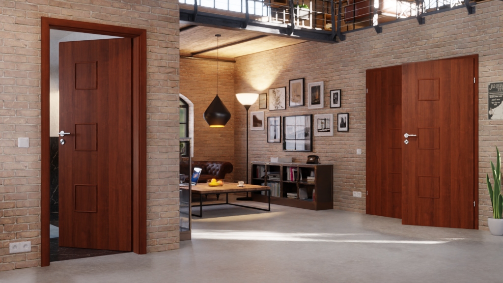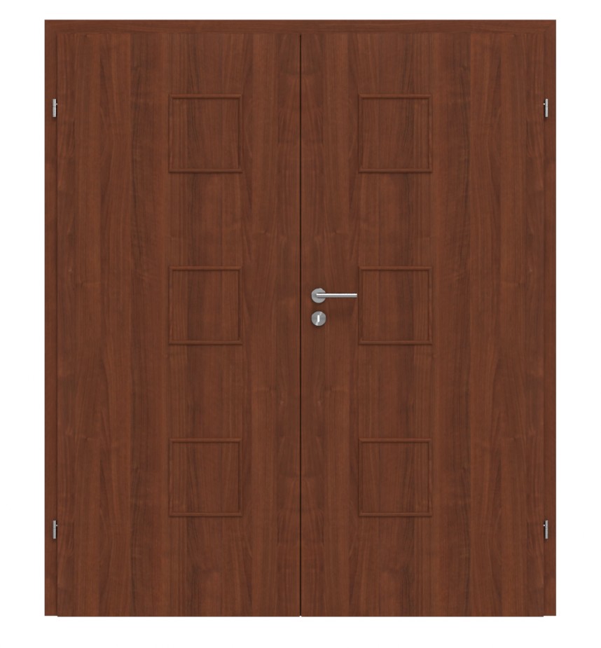 Ciemny odcień nadaje powierzchni dekoru drewna rustykalny wygląd. Dzięki kwadratowym kasetom skrzydło drzwi podwójnych zyskuje indywidualny charakter.