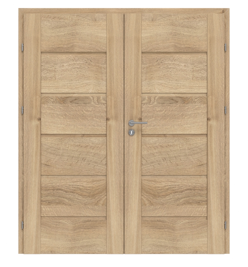 Proste frezowania dzielą dwuczęściowe skrzydło drzwi na kilka stref, tworząc wyraźny, geometryczny wzór. Dzięki strukturze porów dekor dębowy zyskuje trójwymiarowy wygląd, przypominający forniry drewniane.