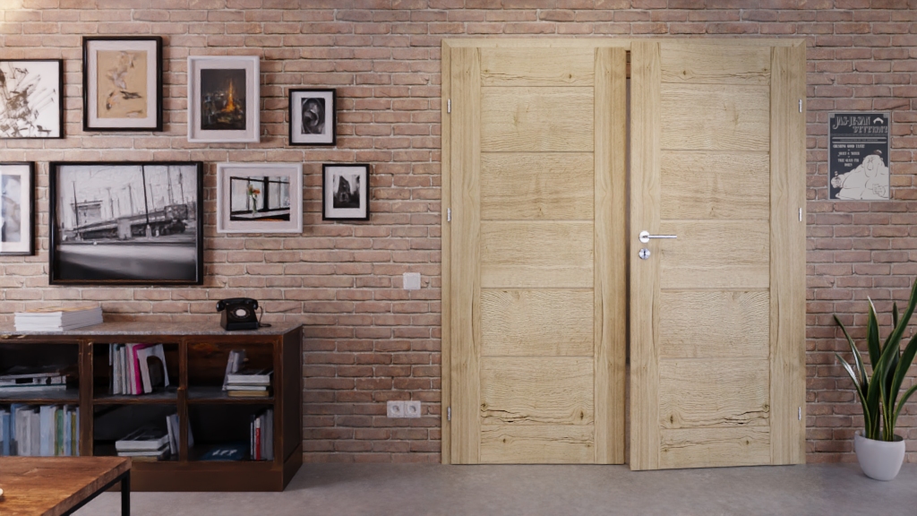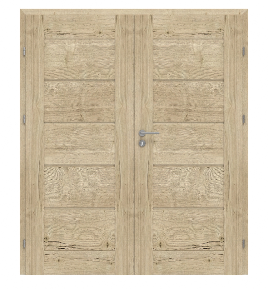 Solidne drzwi podwójne z zamkiem wpuszczanym i sześcioma zawiasami: