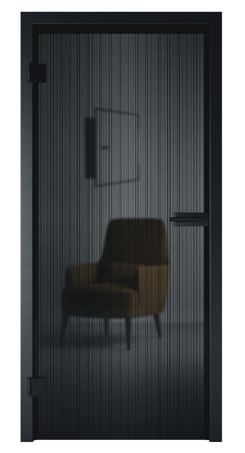 Wyjątkowa elegancja charakteryzuje skrzydło drzwi ozdobione poziomymi liniami. Ponieważ linie są blisko siebie, niewiele światła przenika przez szkło ozdobione czarnym kolorem.