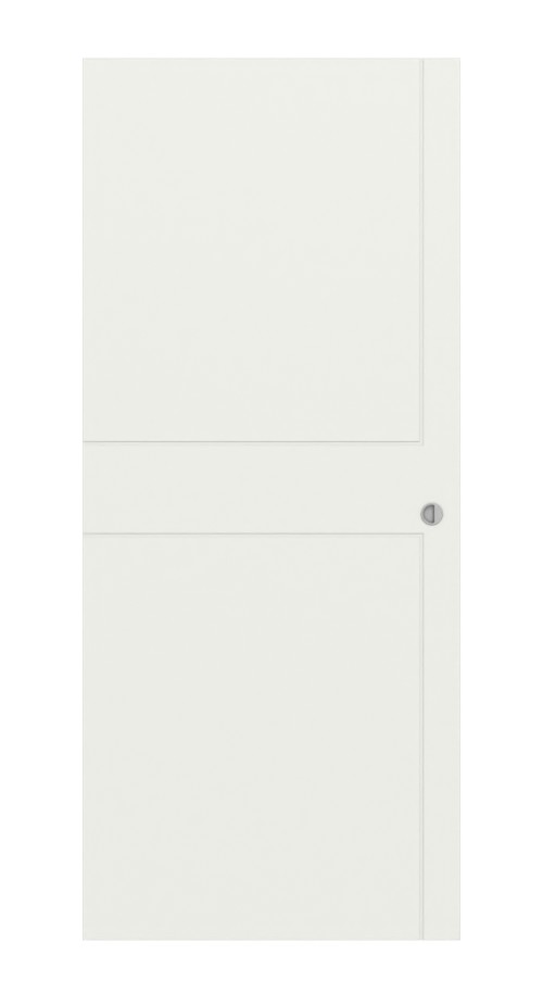 Wytłoczone linie tworzą dwa równej wielkości kwadraty na skrzydle drzwi przesuwnych. Nowoczesny akcent nadaje białe lakierowanie.
