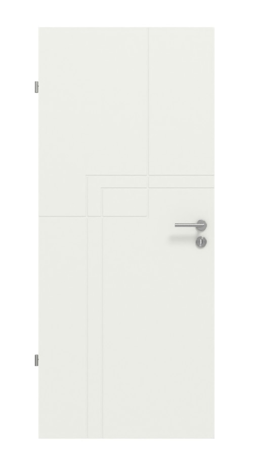 Białe lakierowanie zapewnia nowoczesny wygląd. Indywidualny design drzwi powstaje dzięki nakładającym się poziomym i pionowym liniom.