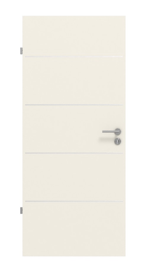 Cztery poziome listwy dzielą skrzydło drzwiowe na pięć równych prostokątów. Dzięki białemu lakierowi powstaje nowoczesny design drzwi.