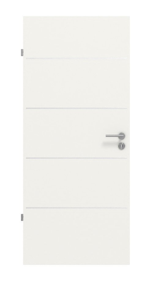 Cztery poziome listwy dzielą skrzydło drzwiowe na pięć równych prostokątów. Dzięki białemu lakierowi powstaje nowoczesny design drzwi.