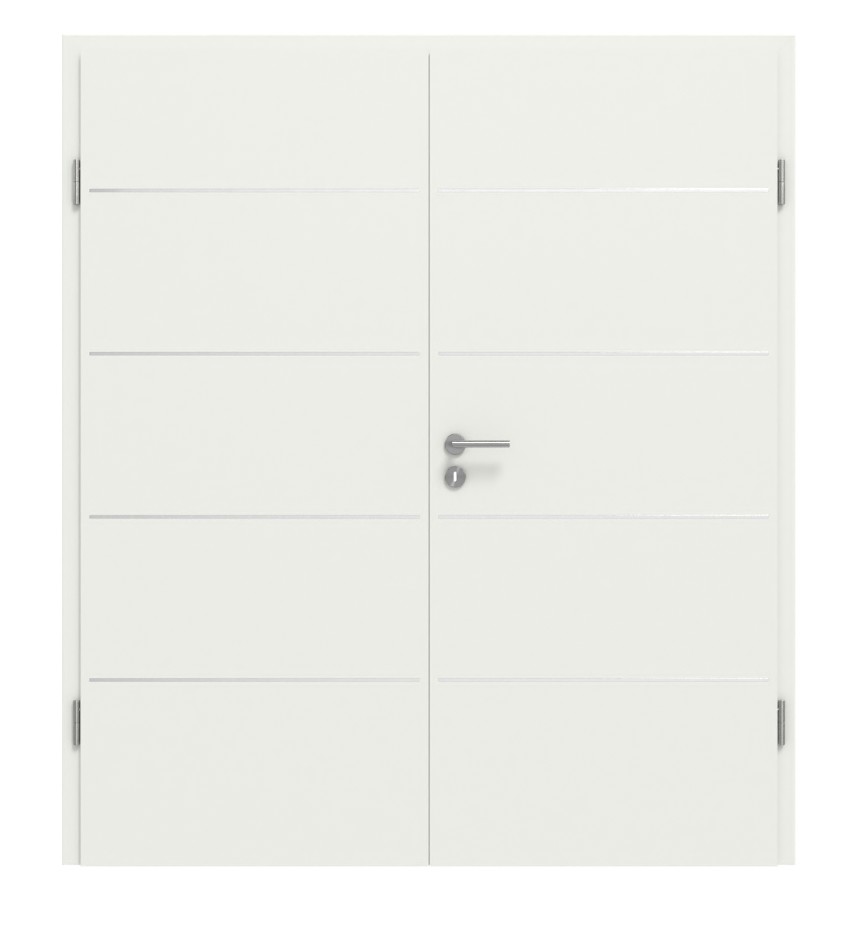 Ekonomiczne drzwi podwójne z lakierowaną powierzchnią: Wybierając drzwi podwójne Dynamic 3.8 w białym lakierze RAL 9003 z listwami od Classen, decydujesz się na łatwość w pielęgnacji i prostą estetykę.