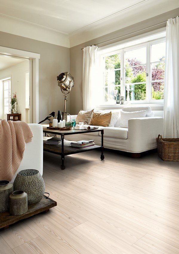 Strukturalna powierzchnia oraz szczegółowe usłojenie laminatu tworzą autentyczne wrażenie drewna. Deski w stylu rustykalnym o matowym połysku nadają pomieszczeniu harmonijny wygląd. Dzięki zintegrowanemu fazowaniu powstaje wyjątkowo realistyczny efekt desek.