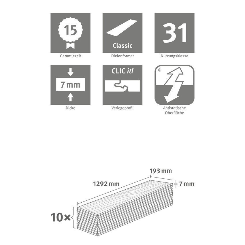 Ten laminat jest wyjątkowo odporny i przeznaczony do klasy użytkowania 32, co czyni go idealnym do intensywnie użytkowanych pomieszczeń mieszkalnych. Dzięki systemowi klik montaż przebiega bezproblemowo, a podłoga jest kompatybilna z ogrzewaniem podłogowym na ciepłą wodę. Ponadto podłoga jest przyjazna dla środowiska, posiada certyfikaty Blauer Engel oraz EU Ecolabel.