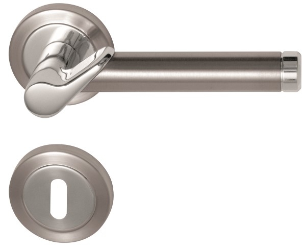 Dzięki połączeniu materiałów z satynowanej stali nierdzewnej i wykończeniami z chromu nadaje drzwiom wejściowym elegancki wygląd. Powierzchnia satynowanej klamki ze stali nierdzewnej jest przyjemna w dotyku. Jednym z wyróżniających się elementów wysokiej jakości zestawu są obrotowe rozetki w optyce rowków. Dwuczęściowy zestaw doskonale uzupełnia purystyczny styl.