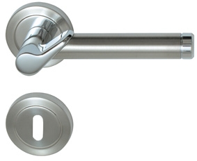 Satynowana stal nierdzewna klamki jest uzupełniona modnym chromowanym wykończeniem w przejściu do rozetki, tworząc harmonijną całość. Powierzchnia klamki zapewnia komfortowy chwyt. Prosta elegancja jest podkreślona matowym okrągłym osłoną rozetki. Grawerowana rozetka obrotowa doskonale wpisuje się w klarowny styl. Zestaw dzięki swojemu ponadczasowemu designowi pasuje zarówno do skandynawskiego wnętrza, jak i do architektonicznie nowoczesnych przestrzeni.
