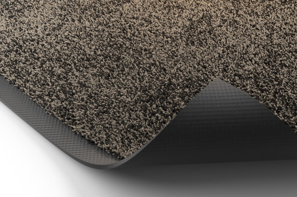 Tył materiału wykonany jest z czarnej gumy nitrylowej. Wystaje ona również po bokach w szerokich pasach - dla większego bezpieczeństwa. Wysoka waga zapewnia lepszą przyczepność. Materiał wierzchni może wchłonąć do 4 litrów wody, chroniąc Cię przed poślizgnięciami. Odchylenia wymiarowe +/- 5% są możliwe w przypadku mat nadających się do prania z powodów technologicznych. Maty na wymiar nie podlegają zwrotowi.