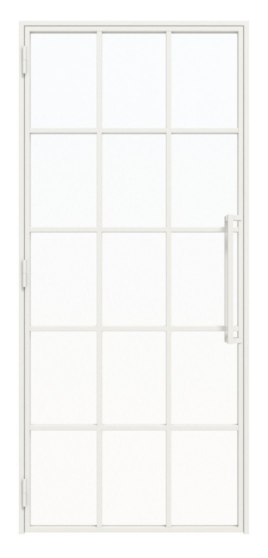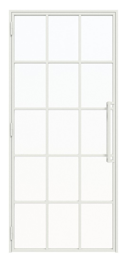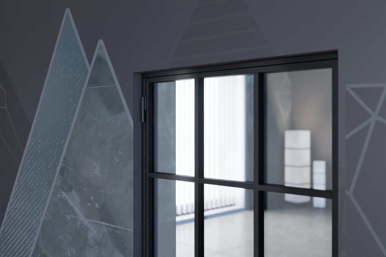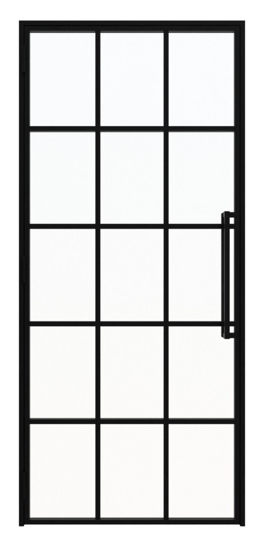 Nowoczesne drzwi loftowe stalowe z ramą z zimnowalcowanej stali oraz spawanymi słupkami pionowymi i poprzecznymi: