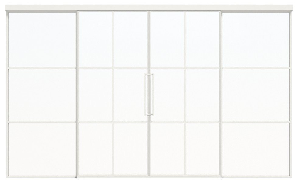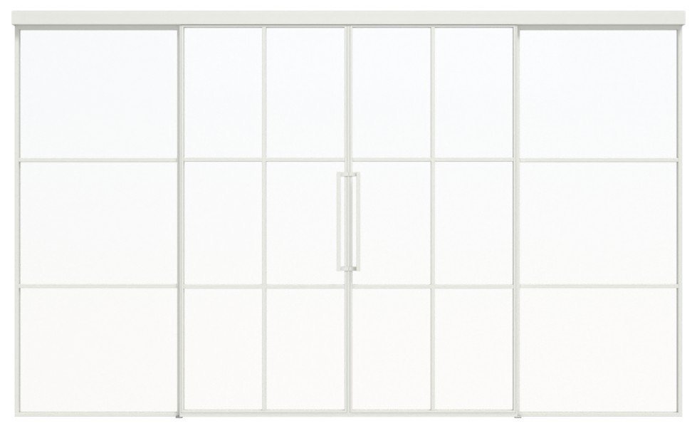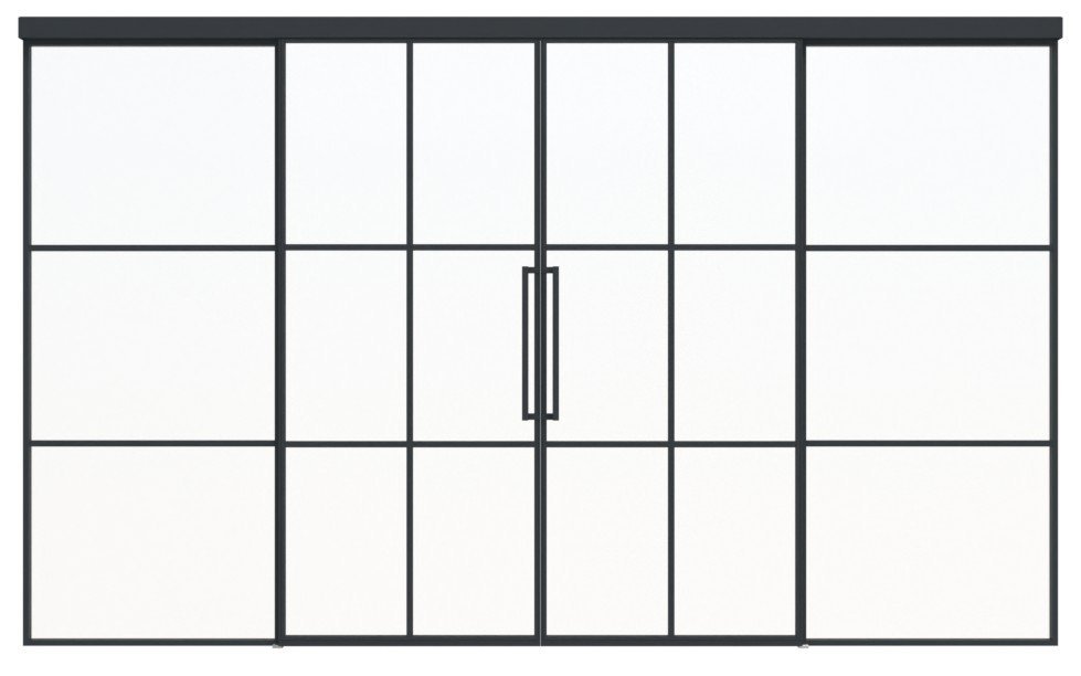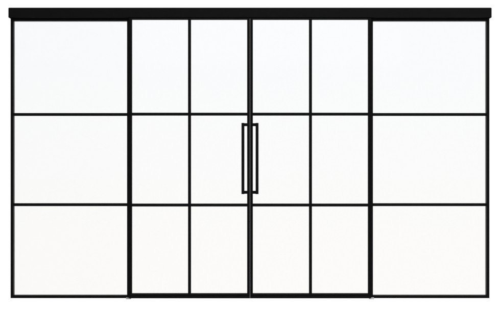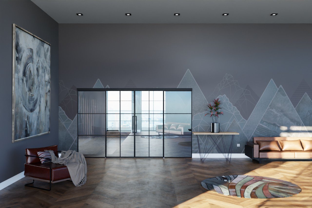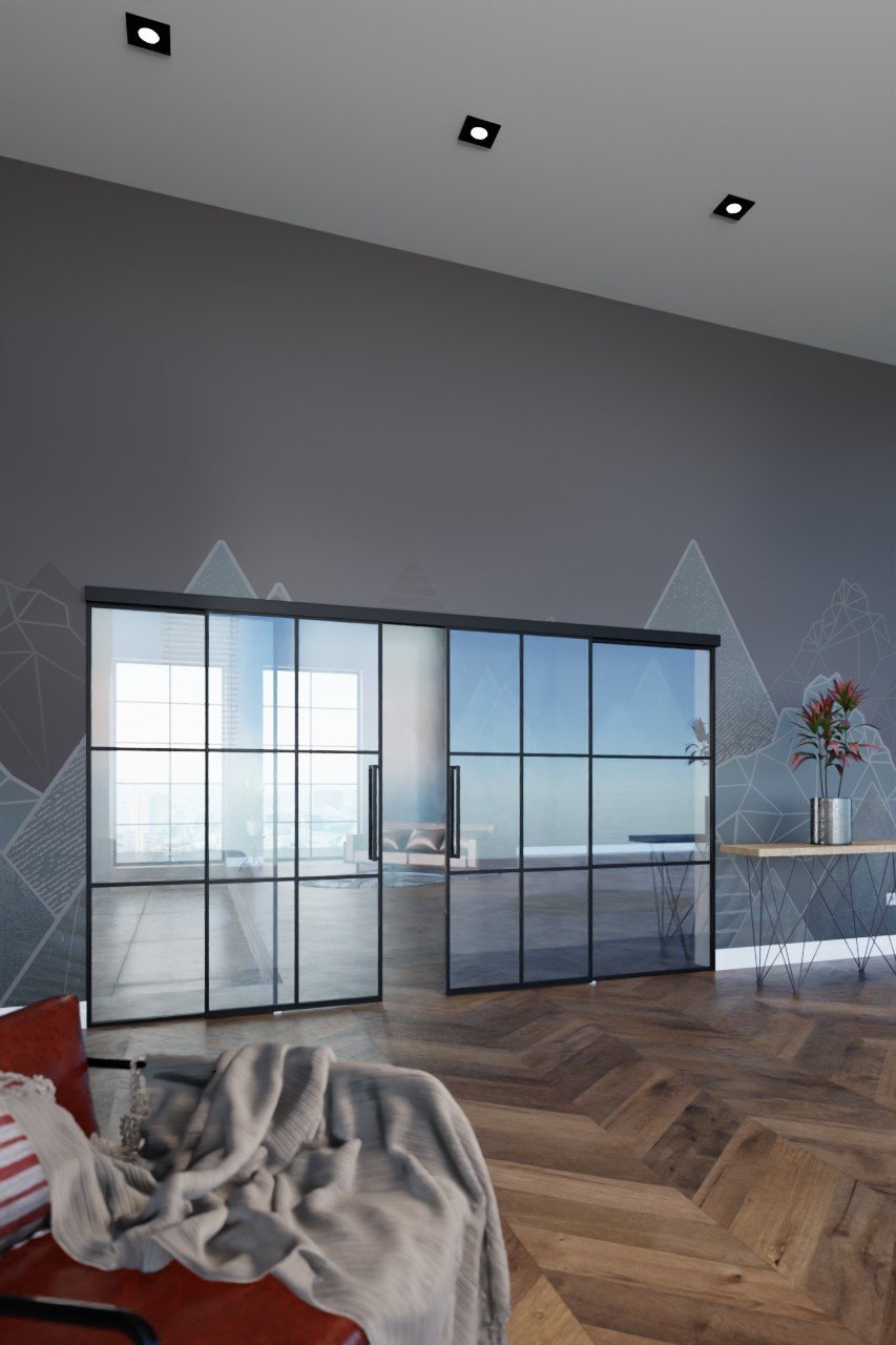 Przestronne stalowe dwuskrzydłowe drzwi przesuwne loft z klasycznym systemem drzwi przesuwnych i spawanymi szprosami: