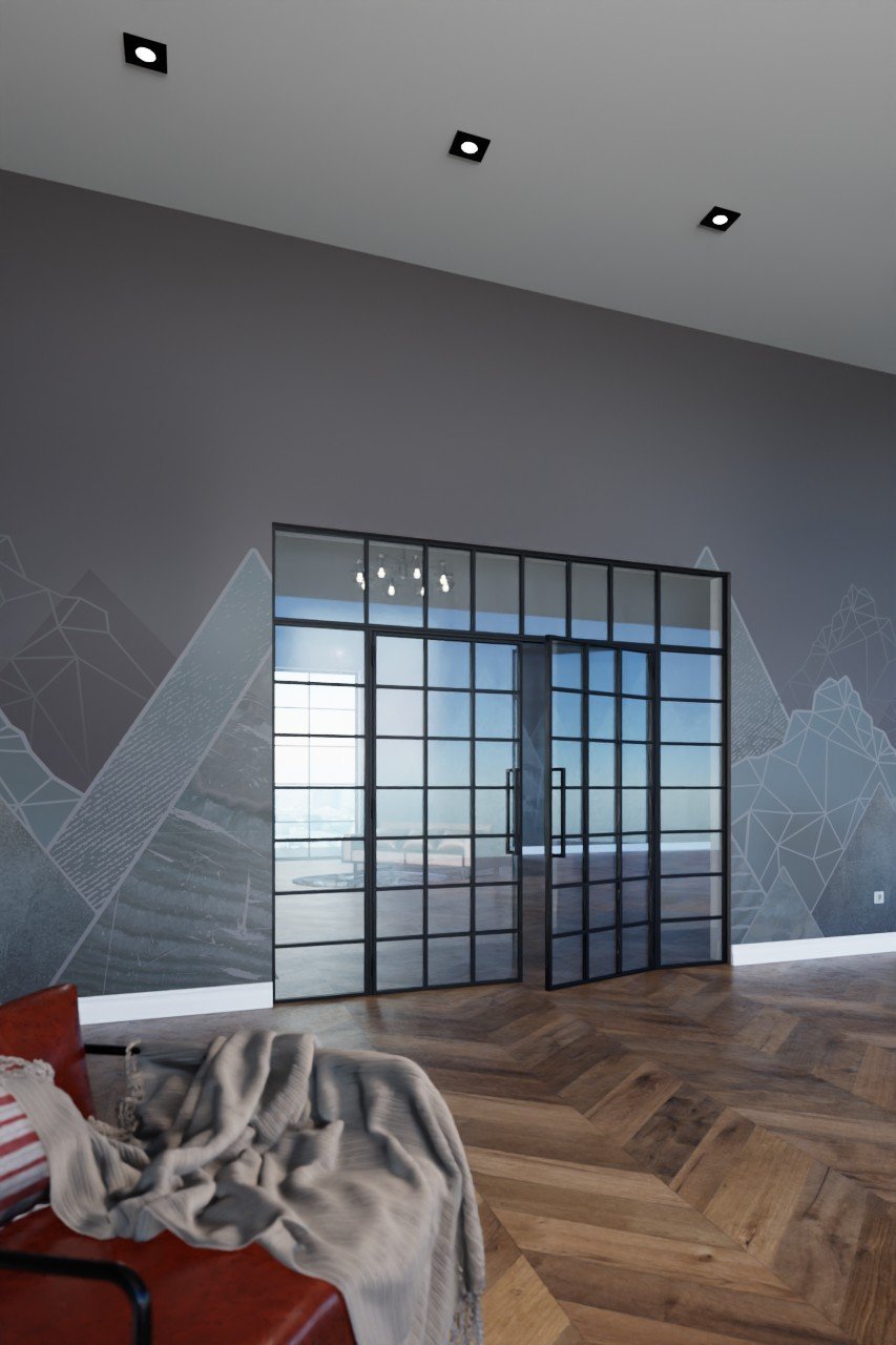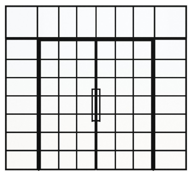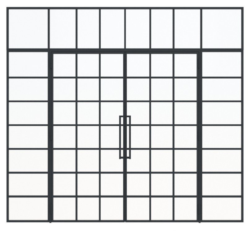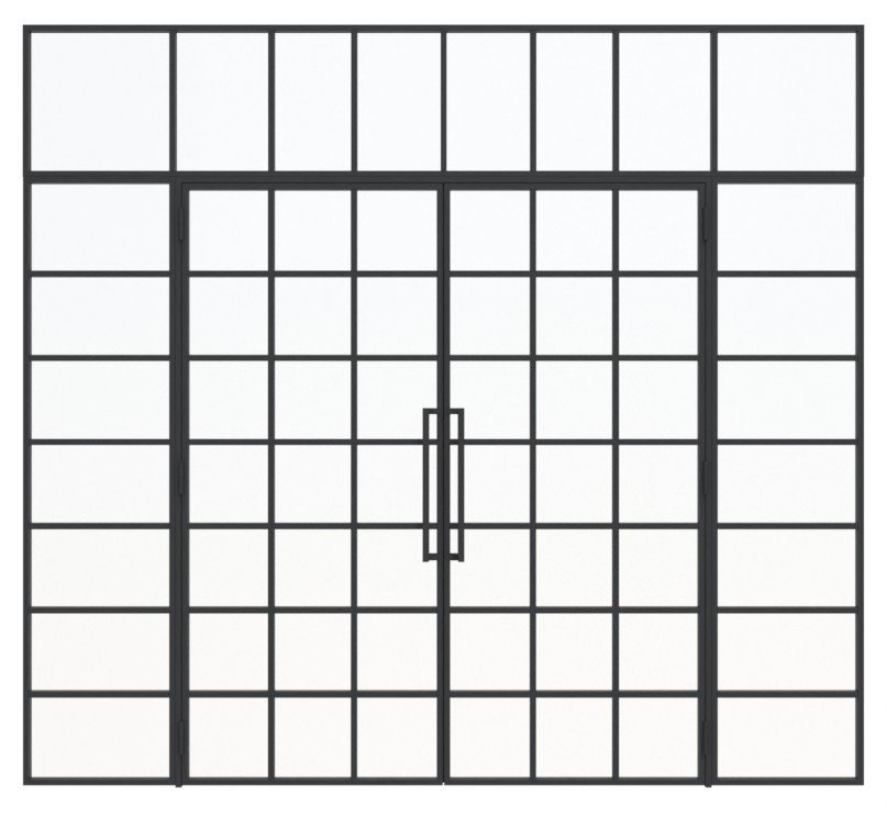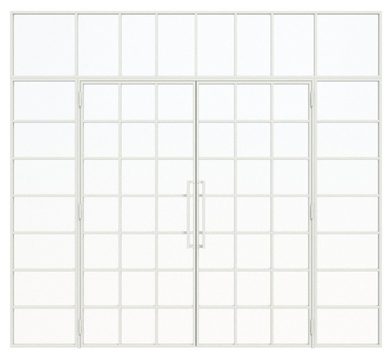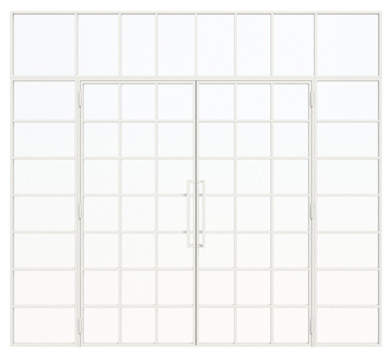 Przestronne 2-skrzydłowe stalowe drzwi loftowe wraz z elementami bocznymi, nadświetlem i stalową powierzchnią z powłoką proszkową: