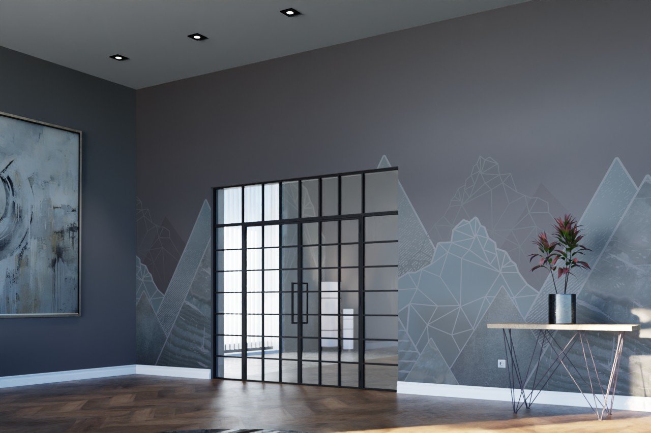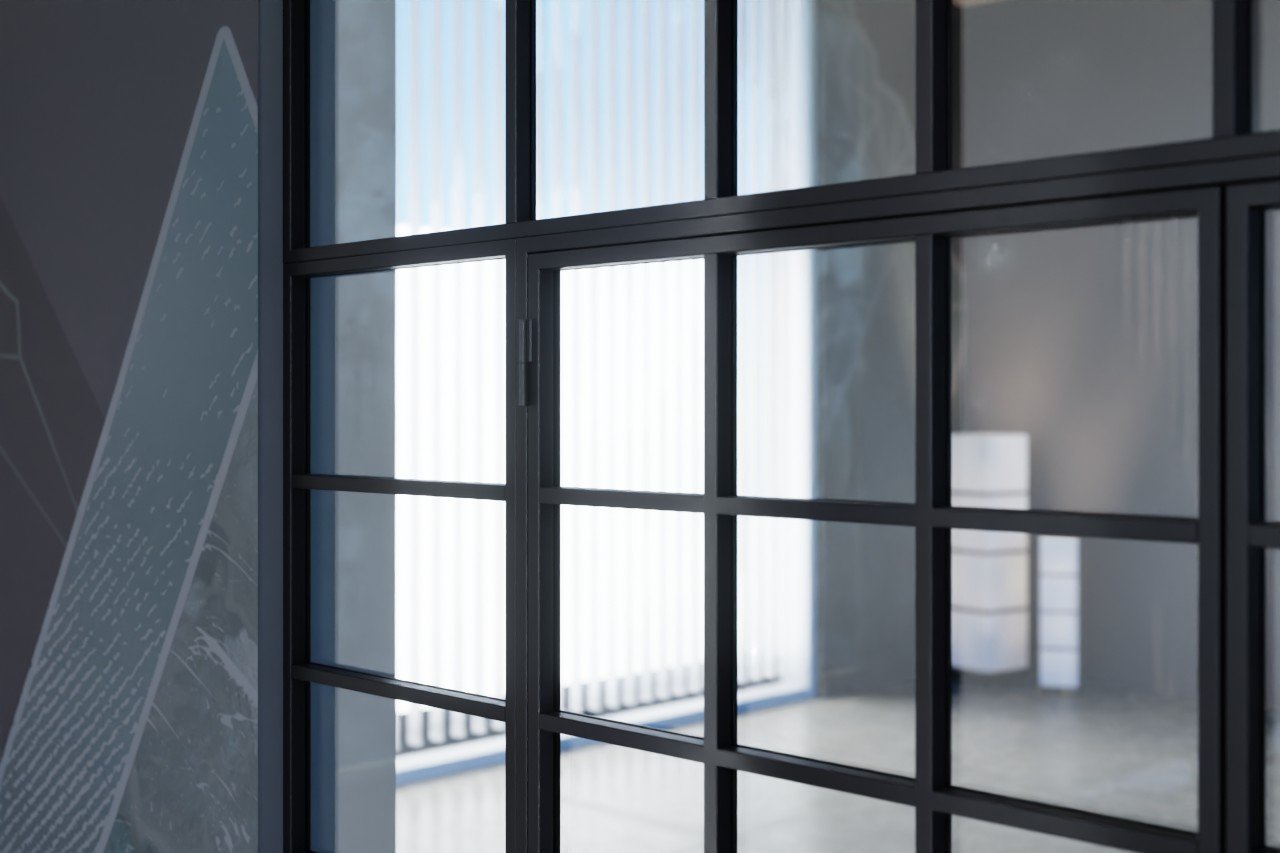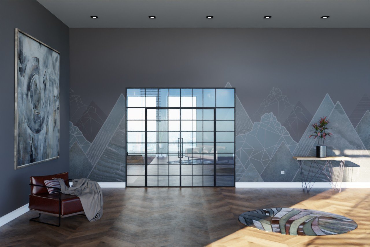 Przestronne 2-skrzydłowe stalowe drzwi loftowe wraz z elementami bocznymi, nadświetlem i stalową powierzchnią z powłoką proszkową: