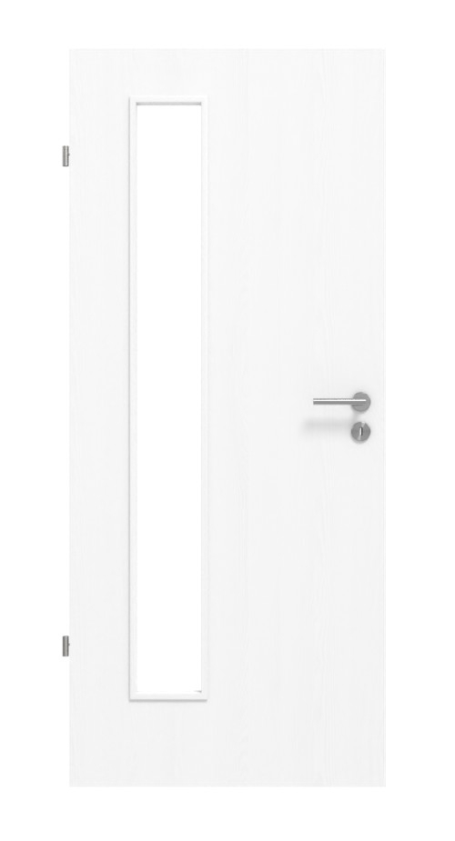 Prostokątny przeszklenie z odpowiednimi listwami szklanymi tworzy nowoczesną atmosferę. Po stronie zawiasów drzwi wąskie otwarcie pozwala na spojrzenie na całą wysokość drzwi. Dzięki temu można zawsze dostrzegać, co dzieje się po drugiej stronie.