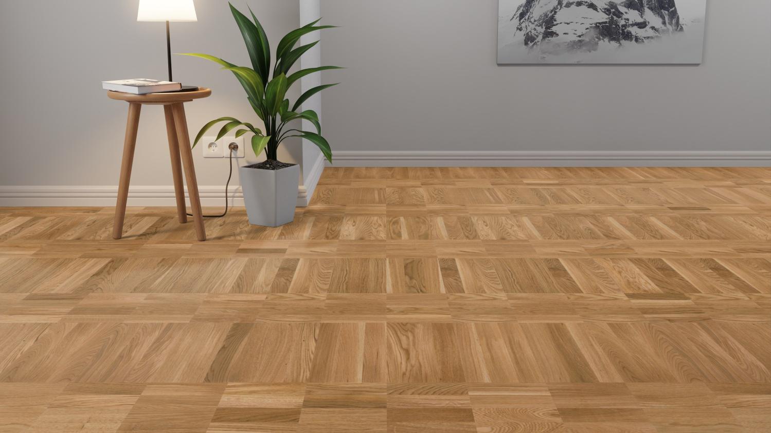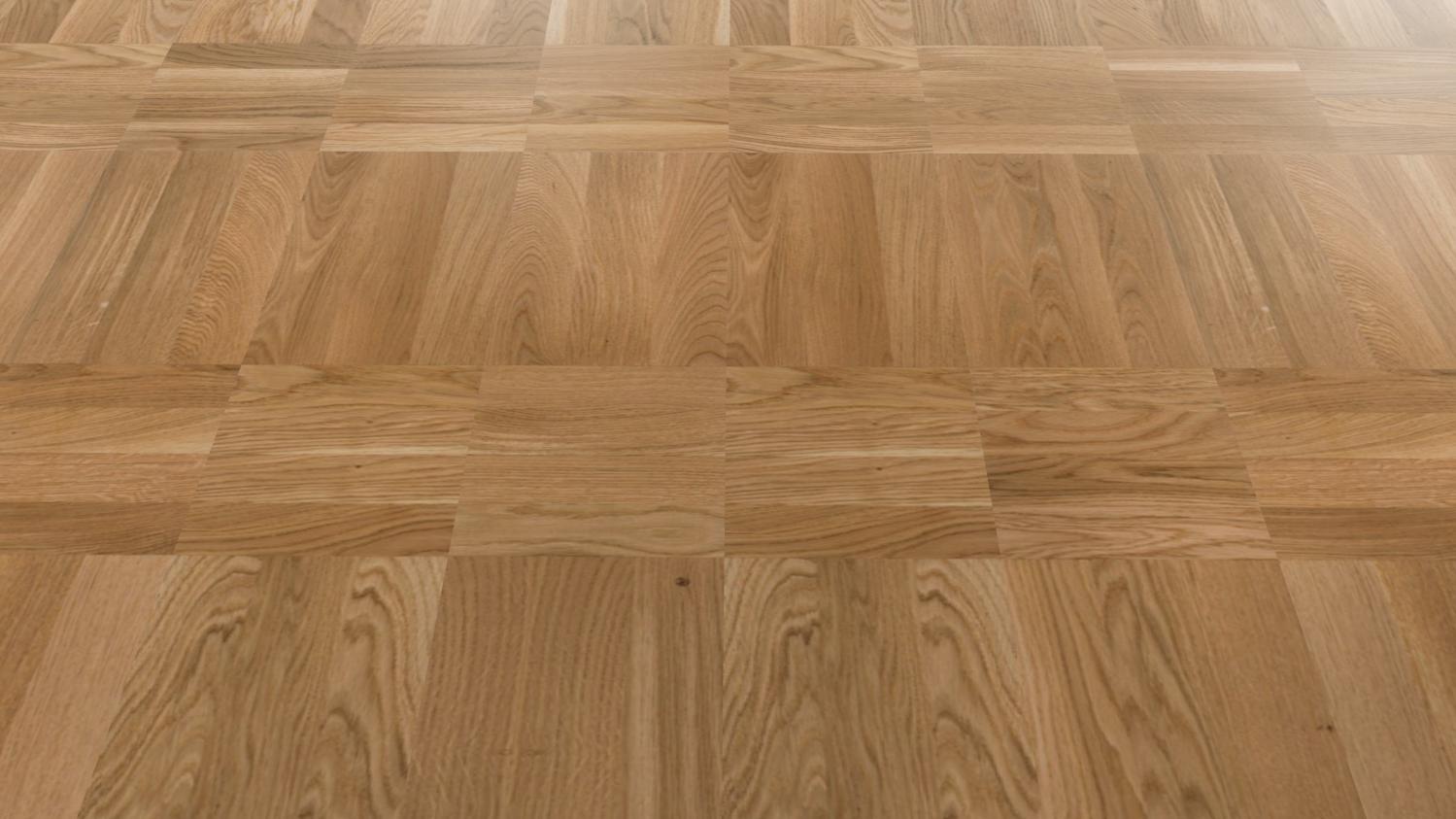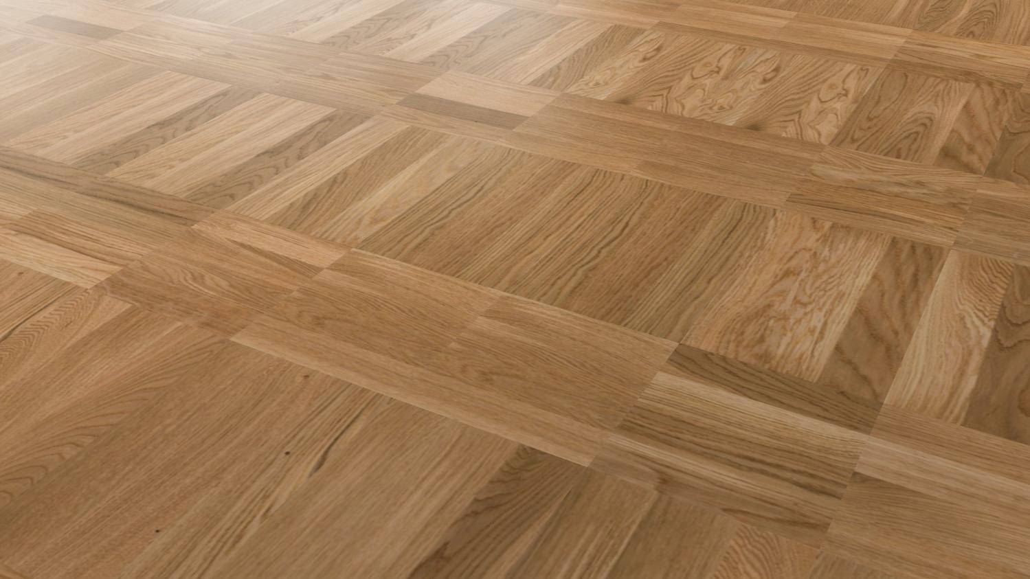 Dynamiczny wzór układania pokazuje drewno dębowe we wszystkich jego różnorodnych odcieniach. Różne kierunki słojów i przejścia kolorystyczne od jasnego do ciemnego zapewniają autentyczny i wyjątkowo urozmaicony wygląd podłogi. Powierzchnia ochronna zapewnia parkietowi niezbędną ochronę.
