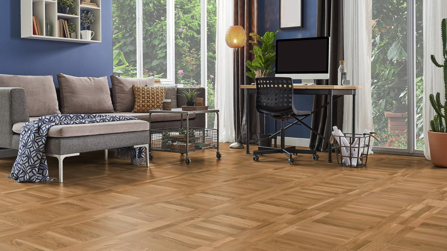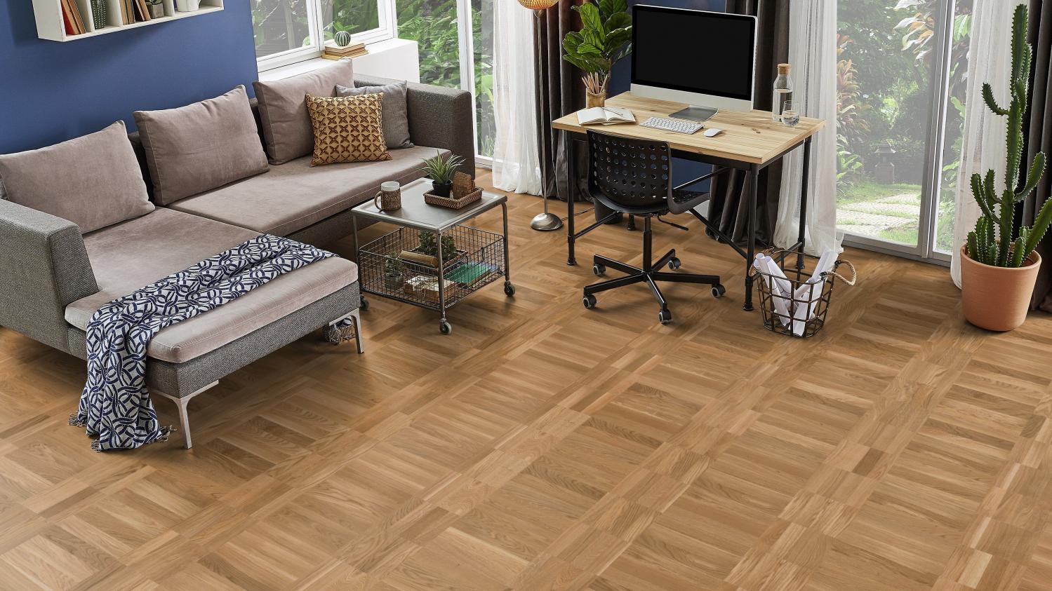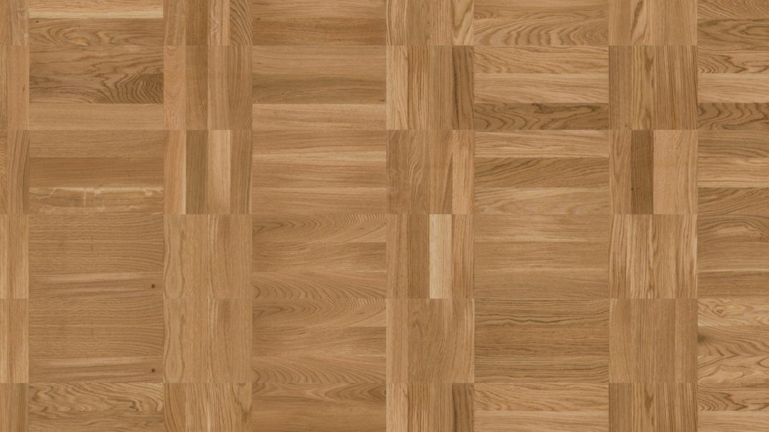 Dynamiczny wzór układania pokazuje drewno dębowe we wszystkich jego różnorodnych odcieniach. Różne kierunki słojów i przejścia kolorystyczne od jasnego do ciemnego zapewniają autentyczny i wyjątkowo urozmaicony wygląd podłogi. Powierzchnia ochronna zapewnia parkietowi niezbędną ochronę.