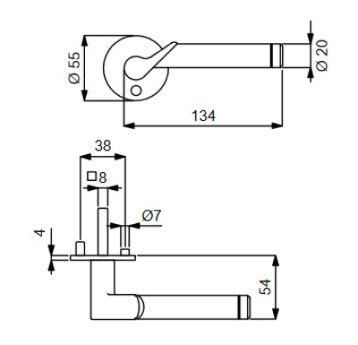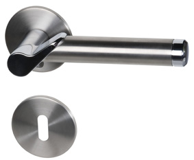Garnitur jest dwuczęściowy z dwoma matowymi płaskimi rozetami. Lekko chropowata powierzchnia uchwytu zapewnia wygodną obsługę. Uchwyt kończy się lekko przesunięty i błyszczący przy górnej rozecie, która dzięki płaskiemu designowi prawie tworzy równą powierzchnię z drzwiami.