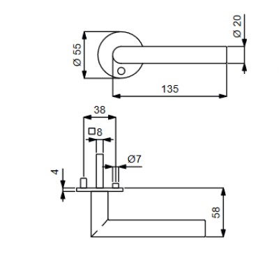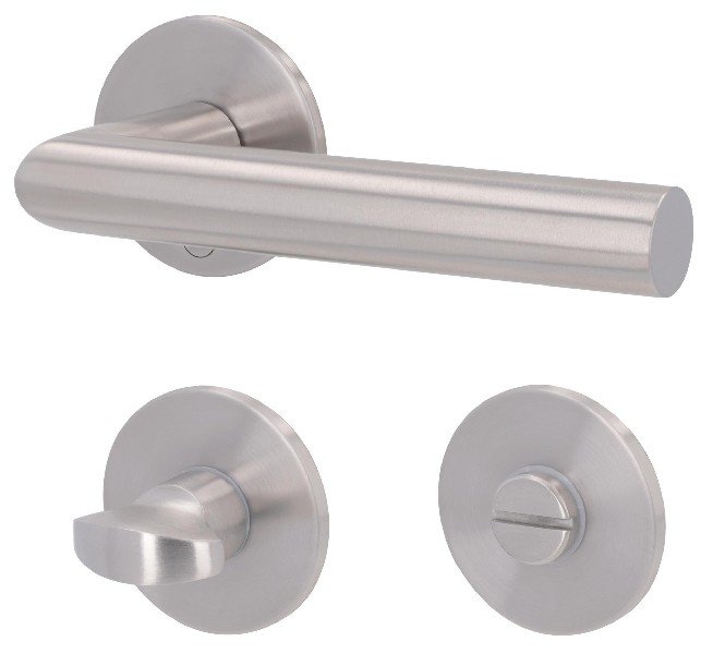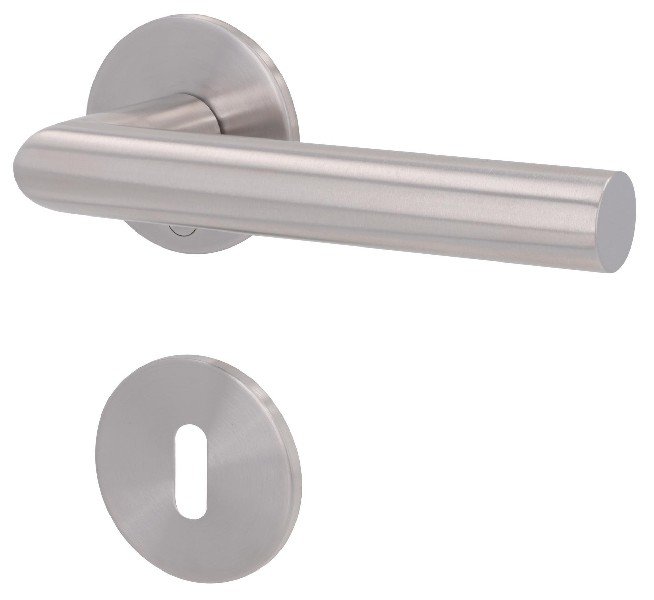 Cylindryczna klamka pokryta jest satynowaną stalą nierdzewną. Prosty design podkreśla zwężająca się krawędź klamki. Dzięki prawie płaskim rozetom okrągłym uzyskuje się harmonijny wygląd zestawu i skrzydła drzwiowego.