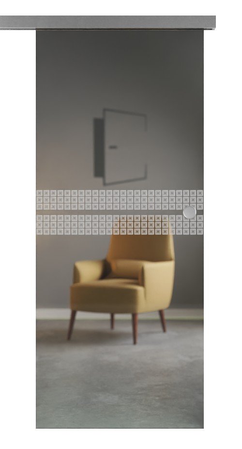 Przez przezroczyste skrzydło drzwiowe przebiegają dwie cienkie wzdłużne belki. Formy składają się z małych kwadratów o subtelnych odcieniach.