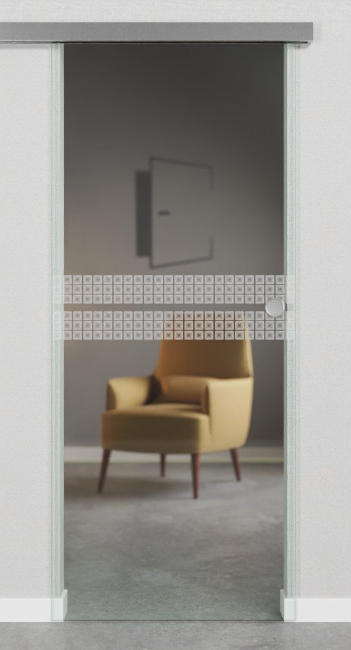 Atrakcyjne, przezroczyste szklane drzwi przesuwne z małymi matowymi kwadratami