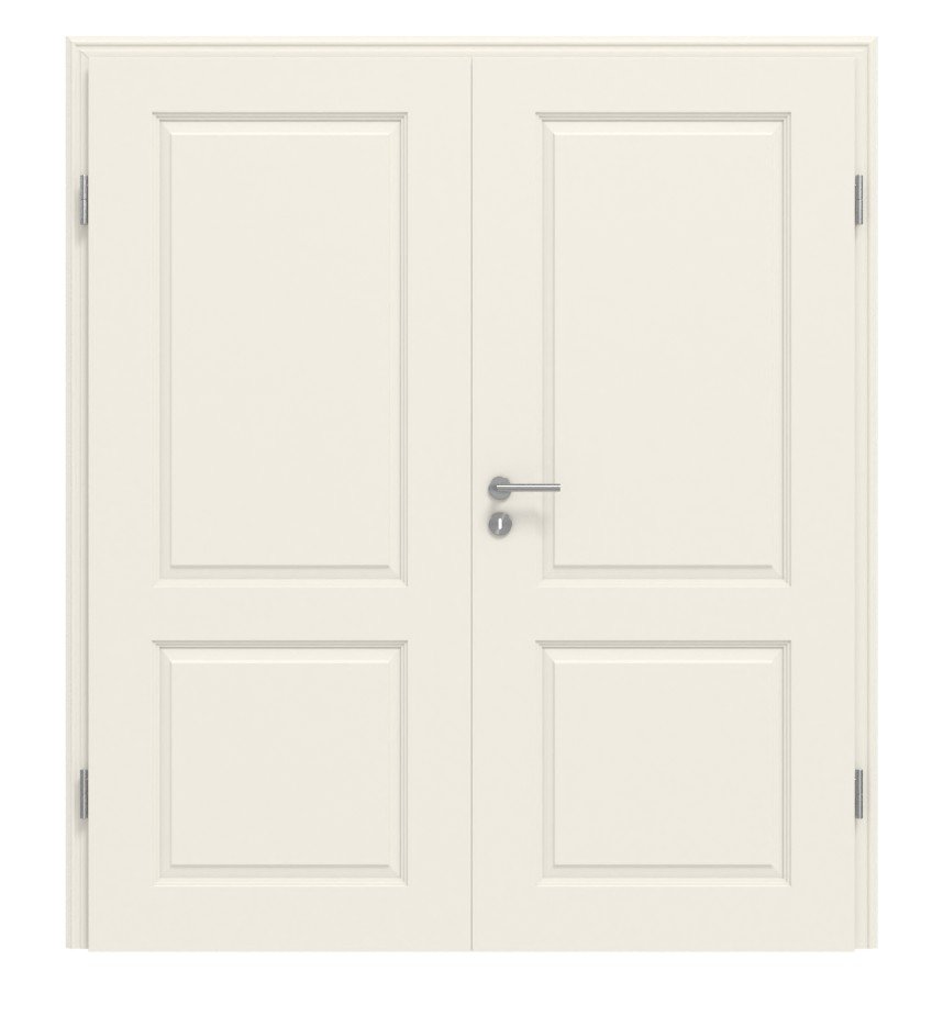 Wysokiej jakości powierzchnia tej podwójnej drzwi powstaje dzięki skomplikowanej wielowarstwowej białej lakierze. Klasyczne profilowania akcentują skrzydło drzwi i doskonale harmonizują wizualnie z formowanym pokryciem, które zapewnia jednolity i spójny wygląd modelu.