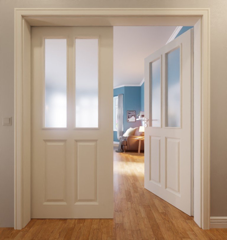 Fascynujący urok tych podwójnych drzwi tkwi w szczegółach: podczas gdy dolna część drzwi ma prostokątne profilowania, górne części skrzydeł są elegancko przerywane przez pionowe wstawki szklane. Tworzą one interesujące akcenty i stanowią wyjątkowe źródło światła w Twoim domu.
